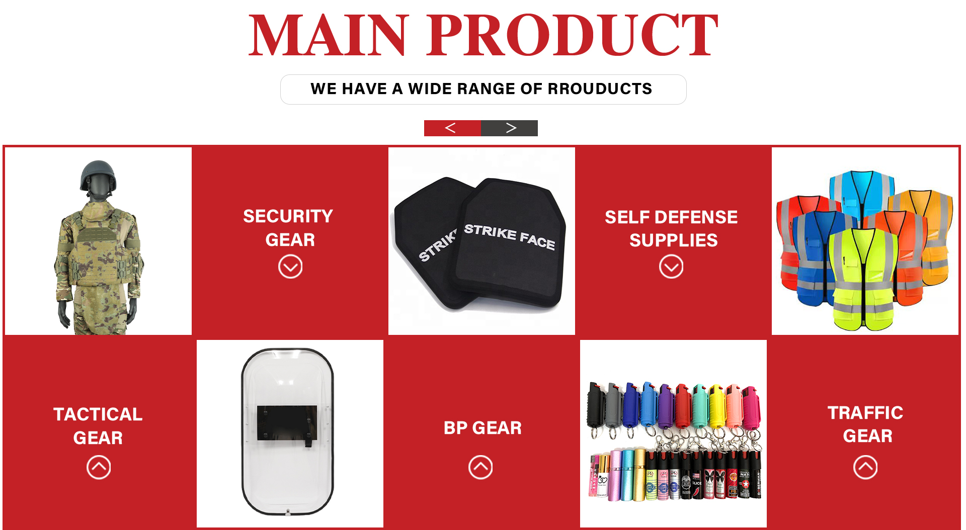 Main categories: Protective Helmet,Protective Shield,Protective Vest,Tactical Vest,Self Defense Supplies